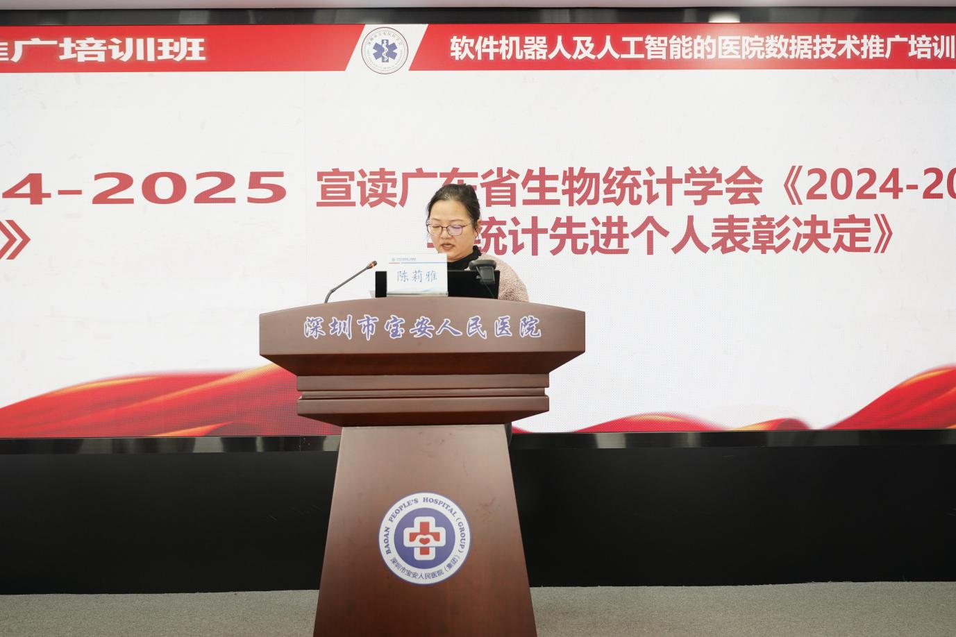 陈莉雅老师宣读广东省生物统计学会《2024-2025年统计先进个人表彰决定》并进行颁奖。该奖项用于表彰在统计领域对医疗行业作出卓越贡献的从业人员,是对从业人员工作的重要肯定和激励。