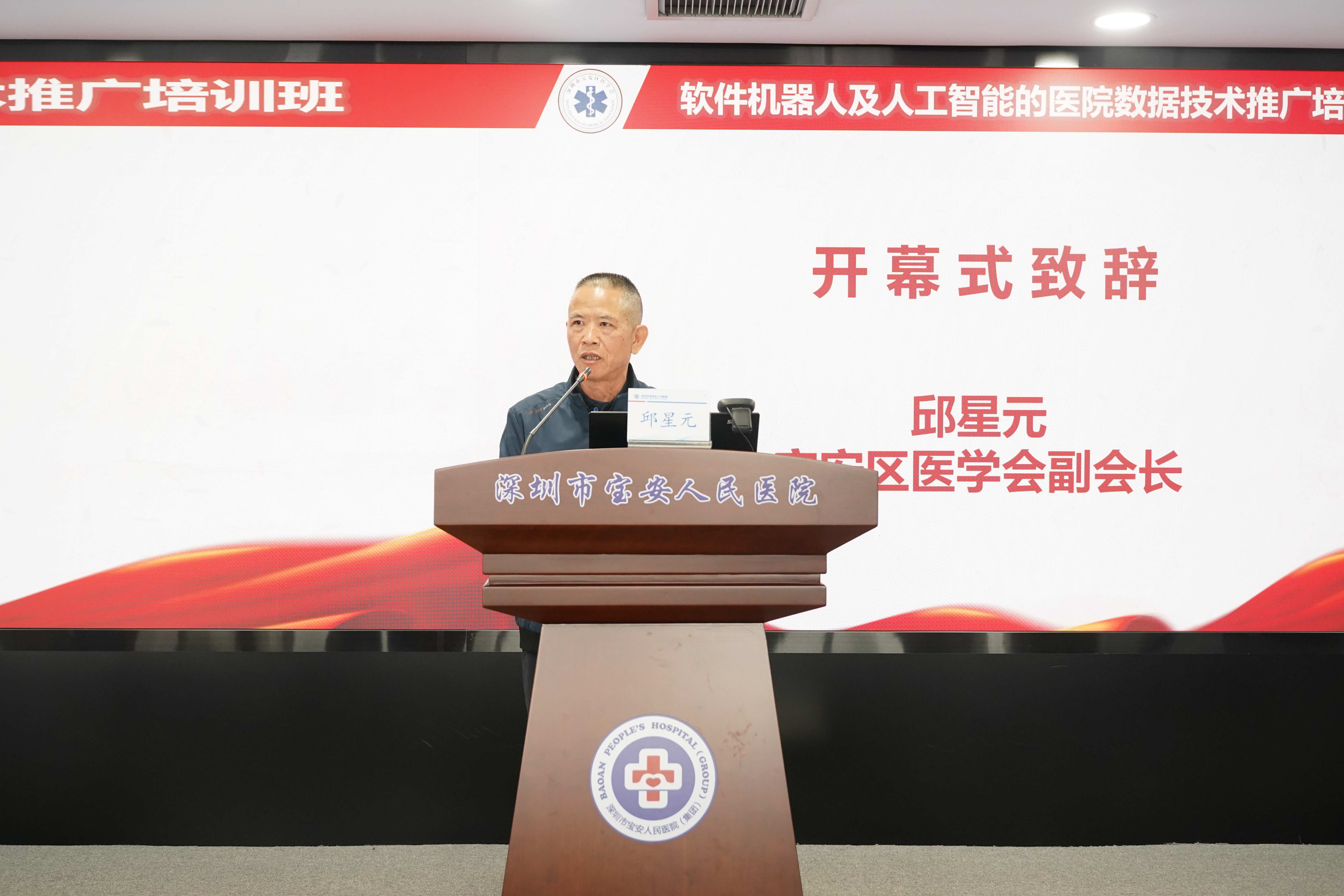 在开幕式上,深圳市宝安区医学会副会长邱星元先生发表了热情洋溢的致辞,对本次培训班的顺利开办表示热烈祝贺。邱星元副会长指出,在当前数据驱动医院高质量发展的关键时期,如何有效提升数据处理的效率与智能化水平,已成为医疗机构面临的核心课题。本次RPA+AI培训班,恰逢其时,意义重大。
