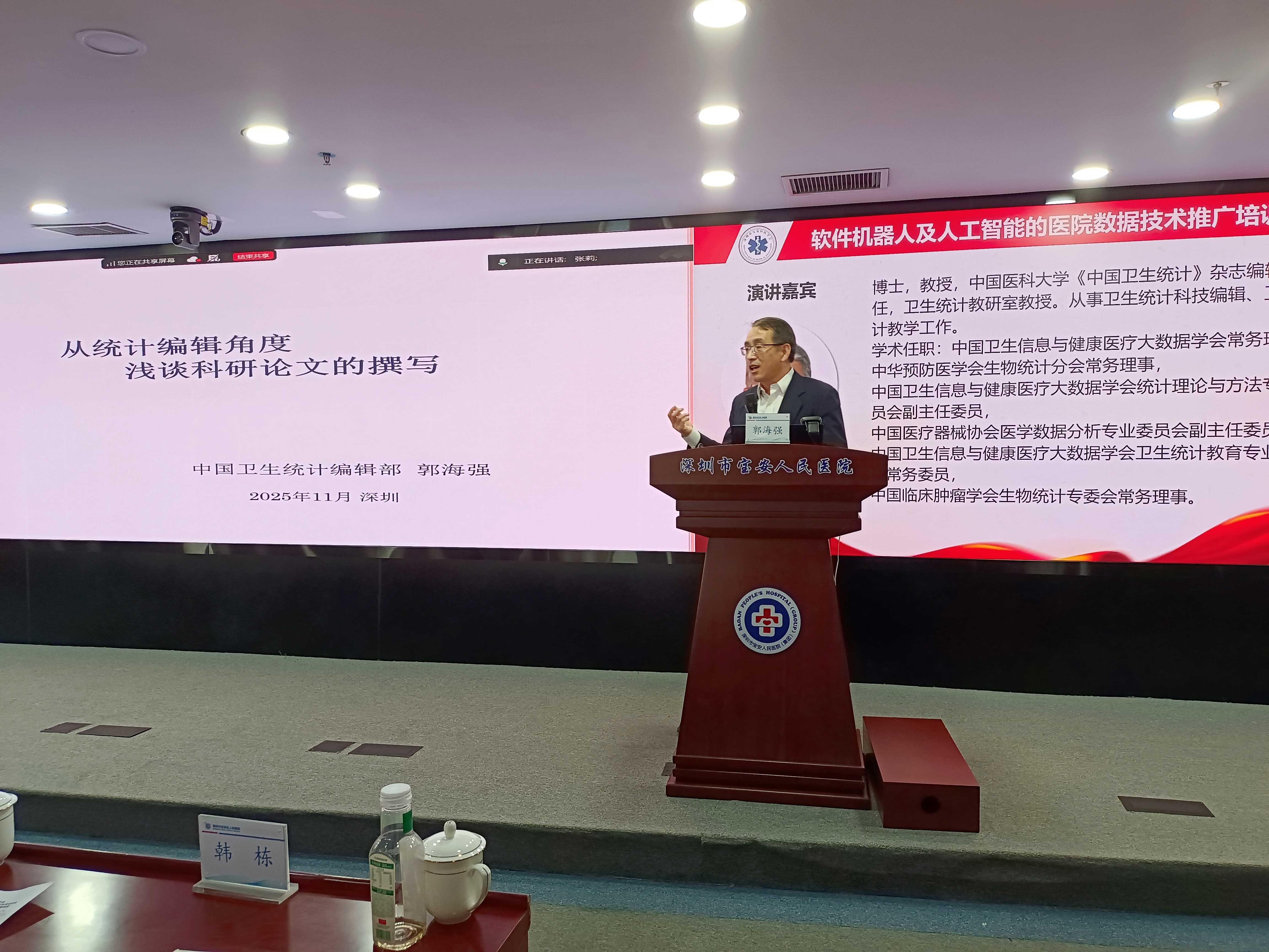 在数据驱动医院高质量发展的浪潮中,一场融合前沿技术与实践应用的智慧盛宴——省级继续医学教育项目“基于软件机器人及人工智能(RPA+AI)的医院数据技术推广培训班” 于2025年11月21日至22日在深圳市宝安区圆满举行。本次盛会由广东省生物统计学会医院统计分会与深圳市宝安区医学会病案统计专业委员会联合主办,深圳市宝安区人民医院倾力承办,汇聚陈玉兵、郭海强、张乐辉等全国顶尖专家学者与广东省人民医院、深圳市人民医院、中山大学、南方医科大学附属医院、深圳市宝安区人民医院等66家单位179名统计相关领域专家、业务骨干参加会议,共同探索医院数据智能化转型的未来路径。